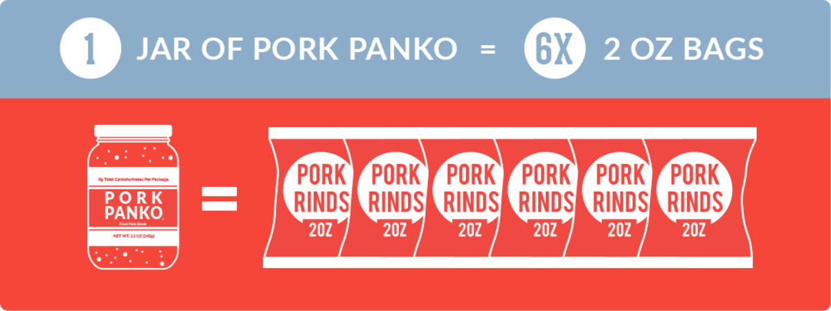 Flaky, crispy, panko bread crumbs made exclusively from finely ground pork rinds cooked in their own rendered fat. Made using only two ingredients: pork skin and rock salt.