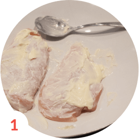 Use a brush to evenly coat both sides of the chicken with mayo to create the binding for the Pork Panko